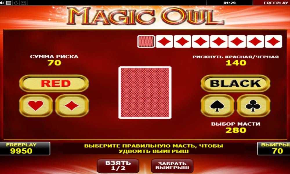 Der Spielautomat verfügt über dasQuotenspiel. Um Ihre Gewinne zu maximieren, müssen Sie die Farbe oder das Symbol einer verdeckten Karte erraten.